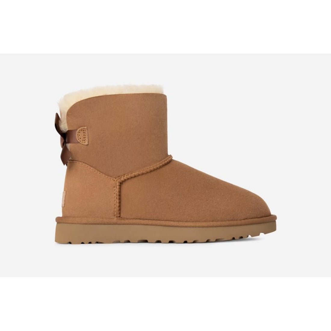 We added silky bows to our icon for a sweet, feminine look that's always been a fan fave. Crafted with soft sheepskin, this versatile boot incorporates a durable, ultra-lightweight sole to increase cushioning and traction.The outsole of this product is either a sugarcane EVA outsole, which is a responsible compound using sugarcane foam that allows us to reduce dependency on fossil fuels by replacing petroleum-based ethylene, or a Treadlite by UGG® outsole.This product was made in a factory that supports women in our supply chain with the help of Reimagining Industry to Support Equality (RISE). This collaborative initiative creates partnerships with brands like ours to empower and educate women in the workplace. | Protected: Post Applied Treatment. Topically applied water repellency treatment. 17mm Twinface sheepskin upper. Fixed satin bow along back shaft, Suede heel counter. 17mm sheepskin lining. 17mm sheepskin insole. Sugarcane EVA outsole or Treadlite by UGG® EVA outsole. Polyester binding or 100% recycled polyester binding. 6 inch shaft height. The UGG® Logo embossed leather heel label. Best for: Casual. RN 88276. This product contains real fur from sheep or lamb. Fur may be sourced from Australia, Ireland, the United Kingdom, or the United States. It has been artificially dyed and treated.. | UGG® Women's Mini Bailey Bow II Water-Resistant Boot in Brown/, Size 9