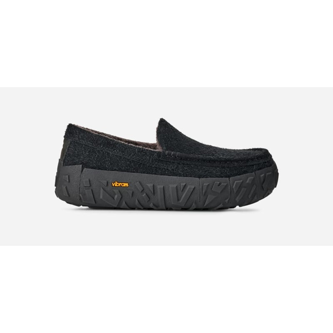 Our Ascot Wrap Tech is where comfort and capability collide for an absolutely hybrid look and feel. This loafer takes our Ascot Slipper into more of your life with a Vibram Wrap Tech outsole that provides superior, out-of-bounds traction and pure, bold fashion. Inside, you'll find our super soft UGG®plush lining and a molded footbed that hugs your foot. Head into new fashion territory filled with comfort and style in our Ascot Wrap Tech.This product was made in a factory that supports women in our supply chain with the help of Reimagining Industry to Support Equality (RISE). This collaborative initiative creates partnerships with brands like ours to empower and educate women in the workplace. | Suede upper. 10mm UGG®plush 60% upcycled wool, 40% lyocell lining. Sockliner textile is made with 10mm UGG®plush (60% Wool, 40% TENCEL Lyocell, 100% UNIFI REPREVE Recycled Polyester Backing). Poured PU footbed incorporates at least 50% bio-based content. Sugarcane EVA midsole. Vibram outsole. The UGG® Logo, debossed. RN 88276. | UGG® Men's Ascot Wrap Tech Suede Shoes in Black, Size 10