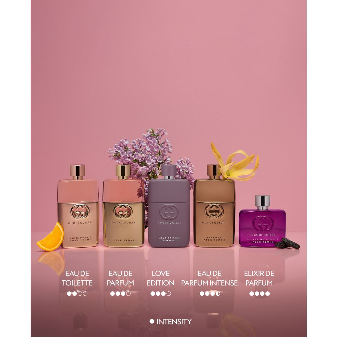 Extending a loving invitation to explore, create and connect with our truest selves, Gucci Guilty Pour Femme and Pour Homme fragrances relaunches with a campaign starring A$Ap Rocky, Julia Garner and Elliot Page. An ode to self-acceptance, friendship and love in all its forms, Gucci Guilty Pour Femme Eau de Toilette for Women presents an ambery floral scent, that inspires a fresh take on blending sensuality with living authentically.The Eau de Toilette is defined by the light, fresh femininity of lilac petals, immersed with a sparkling citrus twist on a trail of rich and sensual amber notes and Patchouli. Opening in the mood of this Gucci scent's signature, the luminous citrus top notes of Mandarin are blended with Pink Pepper for a bright and vibrant freshness. At the heart of this citrus perfume, the lilac floral quality combines with the fruity blend of Peach and Raspberry and with notes of Egyptian Geranium to create a delicate and harmonious contrast. Finally, Patchouli and amber notes reveal the warmth and creaminess of the dry down, echoing the base notes of the women's Eau de Toilette to bring strength and sensuality to the juice.This perfume for women is presented in a shade of metallic rose gold. The bottle is partly wrapped in the colored metal with a matching cap, that features the brand's iconic interlocking Gs, mirroring the fragrance within.