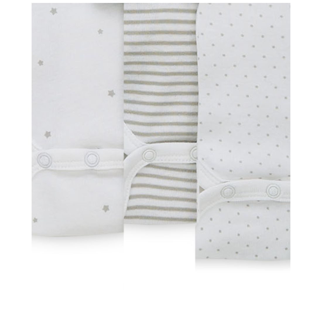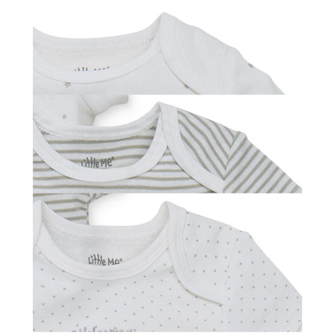 A trio of soft cotton bodysuits from Little Me coordinates beautifully with other pieces from their essential unisex collection.