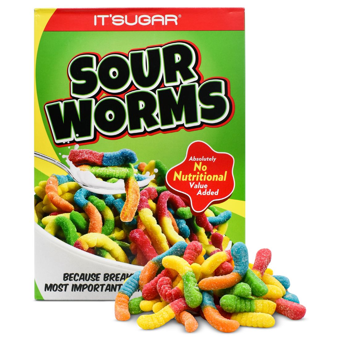 What's more perfect than sour worms a full 1.5 pounds of sour worms in the new big box. Hoard these pucker-worthy sour wigglers or be a real prince charming and give them as the perfect gift. Because, as you know, breakfast is the most important meal of the day.