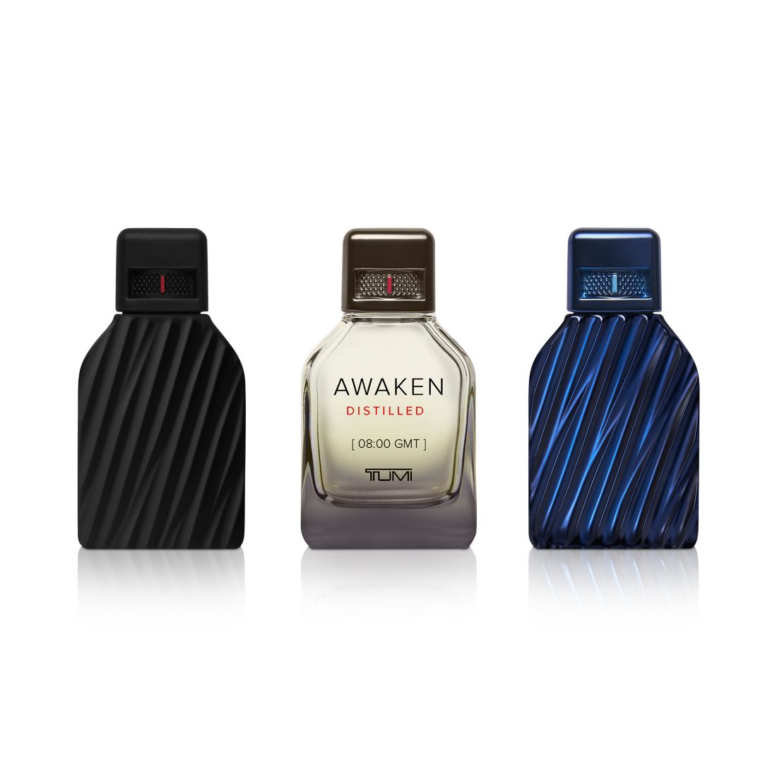 Tumi's Extrait de Parfum Discovery Set features miniature deluxe sizes of 19 Degree, Dusk and Awaken Distilled [08:00 Gmt].