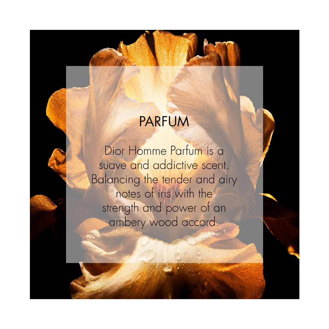 Dior Homme Parfum is reinvented by Francis Kurkdjian, Dior's Perfume Creation Director. Balancing the powdery softness of iris, reminiscent of coffee and chocolate, with a powerful amber patchouli base. As it melts on skin, it unfurls a long-lasting, effortlessly sexy, and irresistible trail. About The Bottle: The iconic Dior Homme men's cologne bottle is adorned by a black lacquer gradient that echoes the warm, ambery tones of the fragrance. The shiny black metal cap features an engraved silver metal plaque with clean, pure lines that emphasize the distinguished allure of Dior's men collections. About The Fragrance: An olfactory interpretation of modern masculinity, thanks to the mysterious power of the rare Iris Pallida. Stemming from an exclusive Dior partnership with a Tuscan cooperative, it takes three years of cultivation and three years of drying and distillation to obtain the rare and precious absolute.