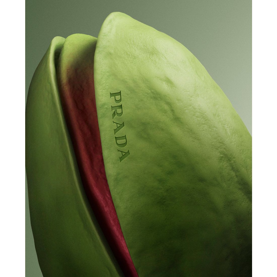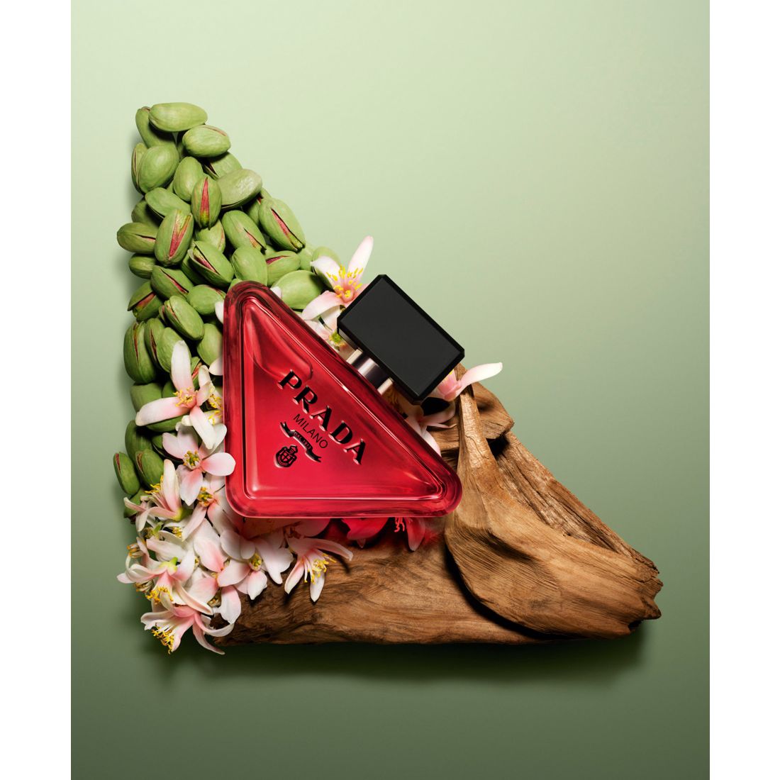 Prada Paradoxe Radical Essence: the most concentrated Paradoxe. This new signature rethinks intensity with a sophisticated, floral gourmand women's perfume. At the heart, an unexpected salted pistachio accord reveals roasted and salty notes enveloped by sweet, edible neroli and creamy sandalwood. In a shift from traditional perfume bottle architecture, the flacon is minimal and delicate at first glance, inspired by the original iconic Prada triangle logo disruptively designed to rest on its side.