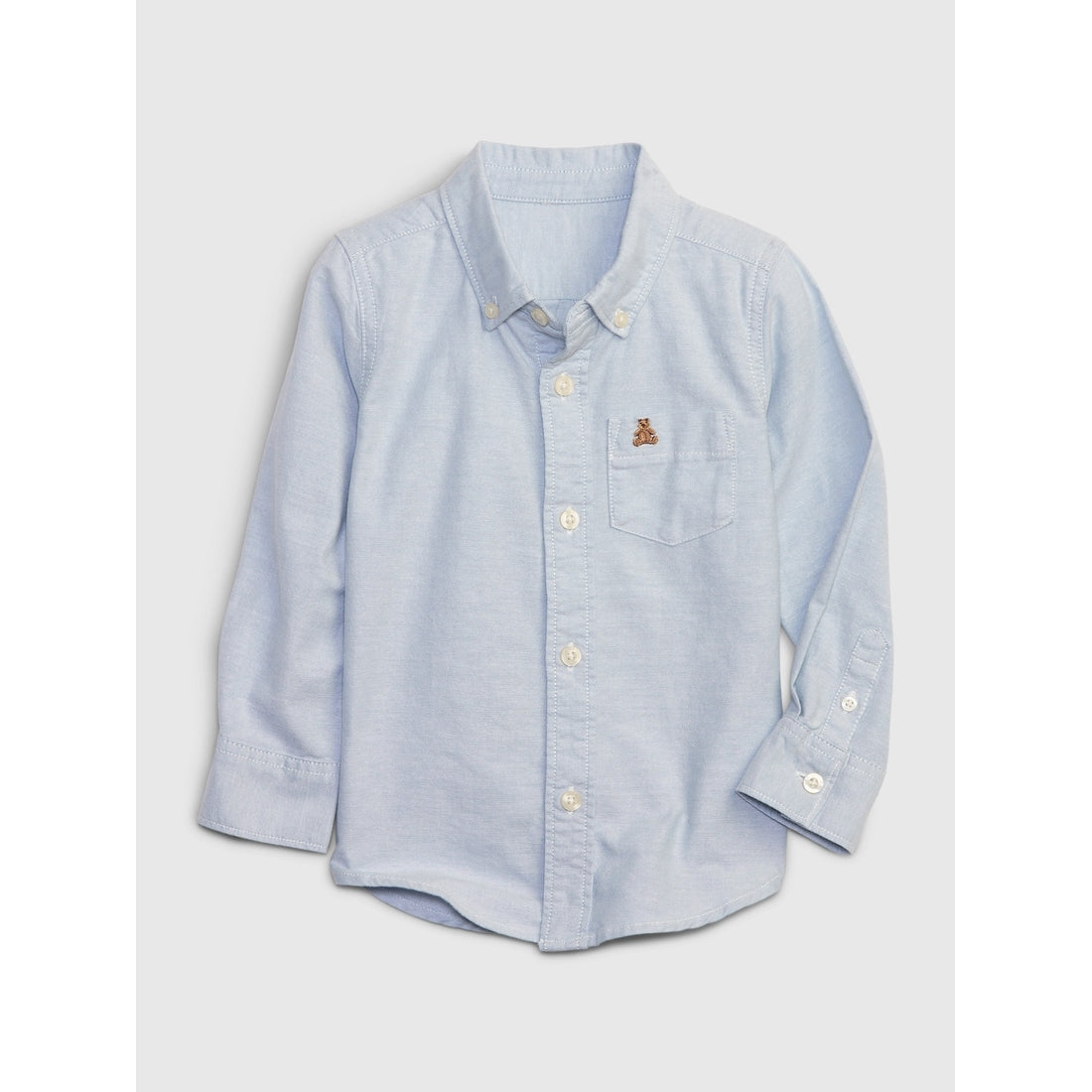 Smooth woven Oxford shirt. Spread collar, button-front closure. Long sleeves. Patch pocket with embroidered Brannan Bear at chest. Made with 98% In-Conversion Cotton. This product supports farmers making the three-year transition toward certified organic farming practices, which do not use synthetic pesticides and fertilizers. This product was made in a factory that runs the Gap Inc. P. A. C. E. (Personal Advancement & Career Enhancement) program. P. A. C. E. is our educational program that helps the women who make our clothes build the skills, knowledge, confidence & resilience needed to advance in work & life. Learn more here. Straight, easy fit. Hits at the hip. Sizes range from baby to toddler.