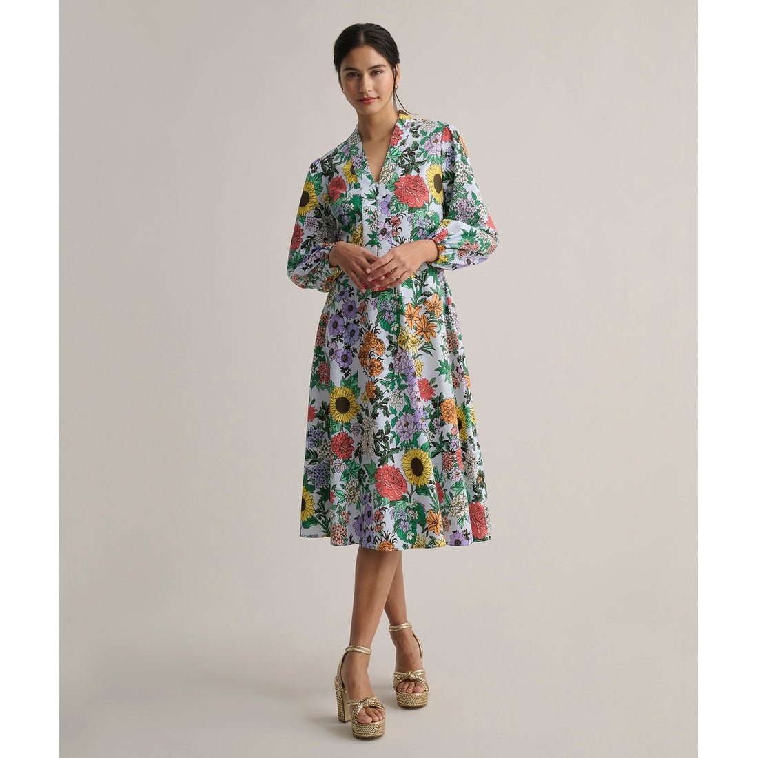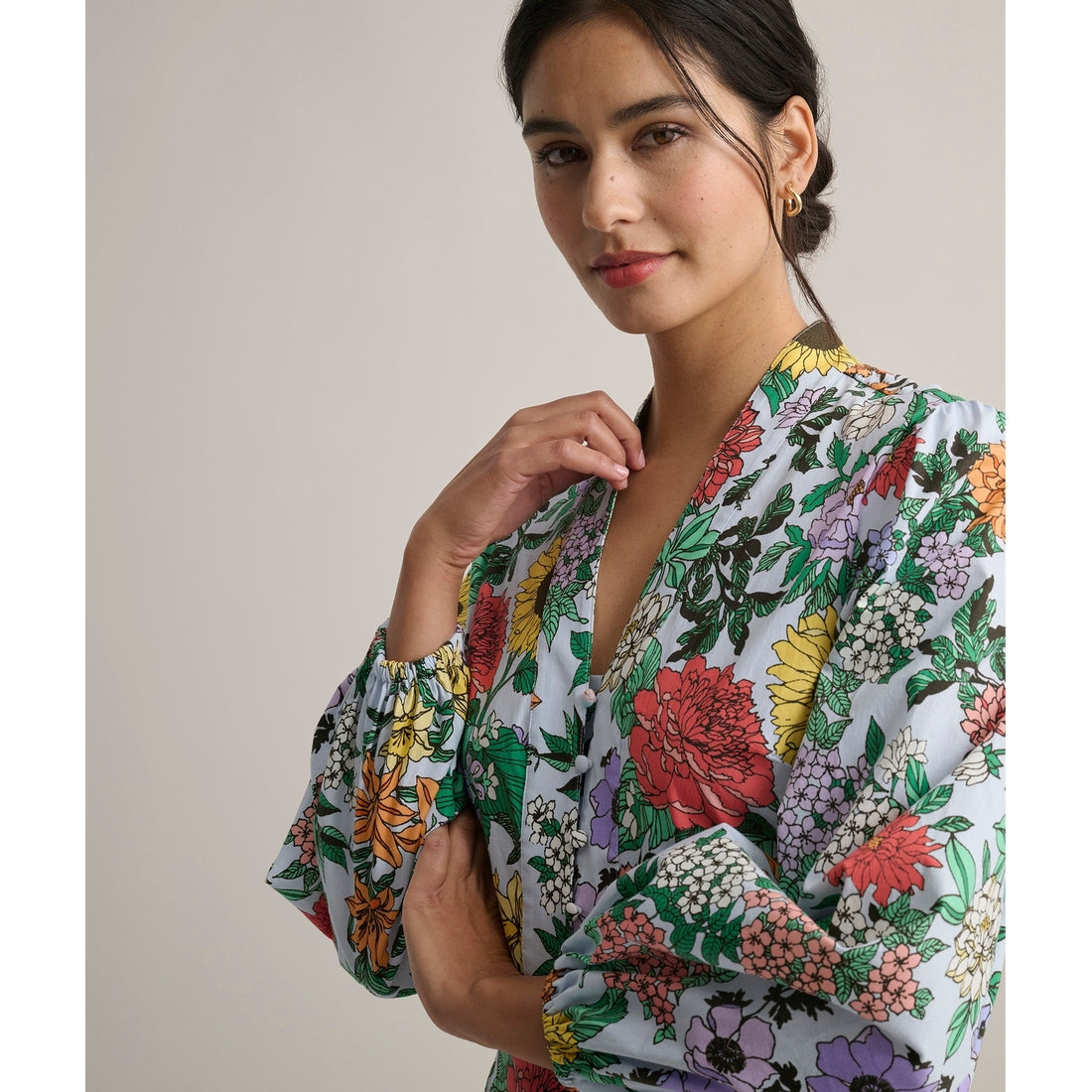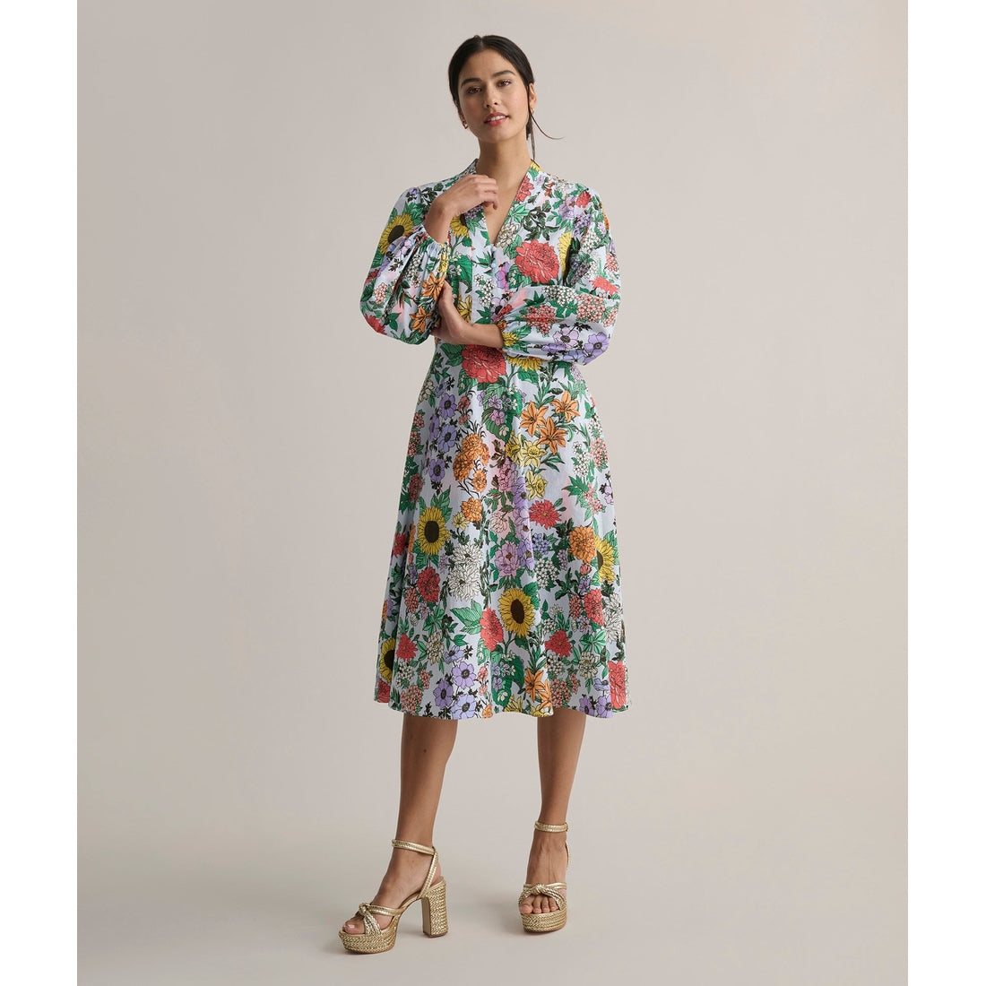 Our twirl-worthy shirtdress in a bold floral print is crafted in a cool cotton with a hint of stretch poplin that gives it a polished look and feel. Detailed with of-the-moment balloon sleeves, A line midi length and a flattering tie waist. It has enough stretch to move with you, and its eye-catching floral print is sure to make it the most vibrant style in your closet. Wear it to the wedding, the special event, and everything else under the sun.