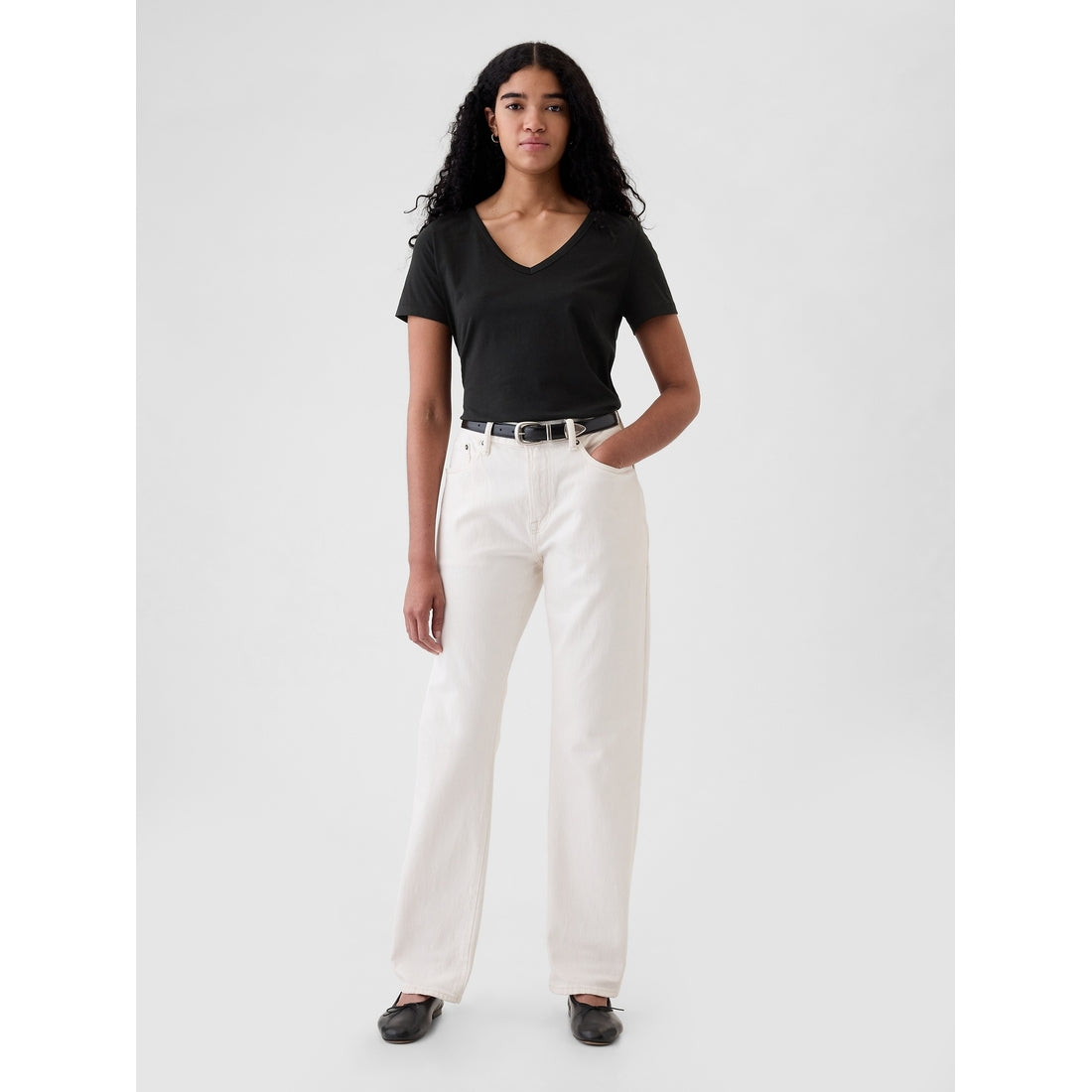 Soft cotton T-shirt. Short sleeves. V-neck. Made with 100% organically grown cotton. Organic cotton is better for people and the environment because it’s grown without the use of harmful synthetic pesticides and fertilizers. This product was made in a factory that invests in gender equality and women’s empowerment. Through RISE (Reimagining Industry to Support Equality) and Gap Inc. ’s program P. A. C. E. (Personal Advancement & Career Enhancement), we support people who make our clothes to build the skills, knowledge, confidence, and resilience needed to advance in work and life. Learn more. here. Fit: Classic. A straight & easy fit. Hits at the hip. Nissa is 5’9. 5”/177cm with a 31”/79cm chest, 24”/61cm waist, 35”/89cm hip wearing a regular Gap size S. Organic Cotton 100. 0