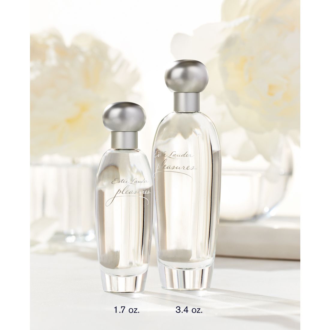 The delightful new spirit in fragrance. Fresh as flowers after the rain, Estee Lauder Pleasures perfectly captures the modern taste for light, transparent fragrances. It is a delightful sheer floral created from lilies and peonies, jasmine and Karo-Karounde blossoms, all tingling with the rare essence of exotic Baie Rose. It reflects a modern woman's desire to experience life's little pleasures every day.