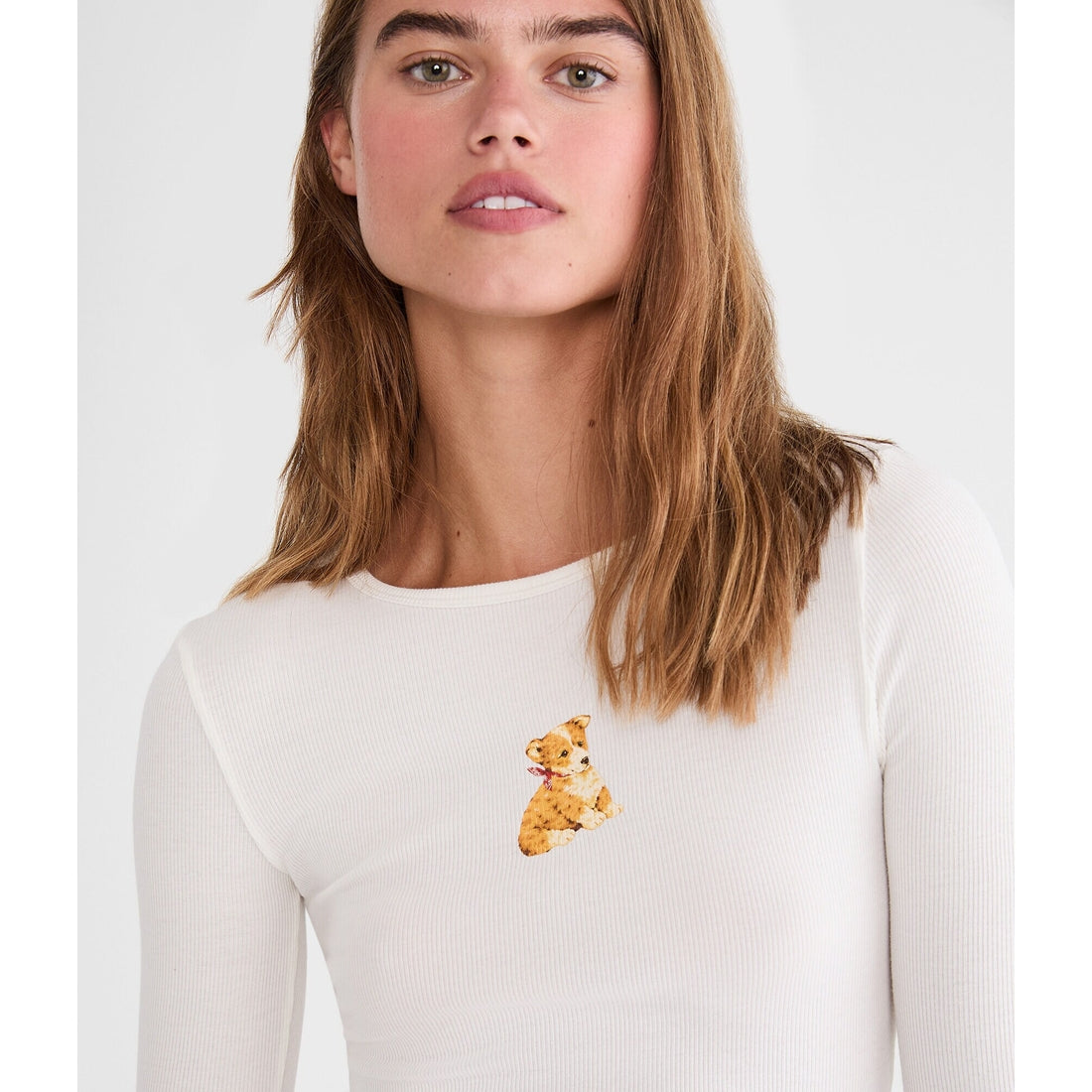 Accented with an adorable pup on the front, this soft slim tee is the perfect match for everything from swingy skirts to wide-leg jeans.