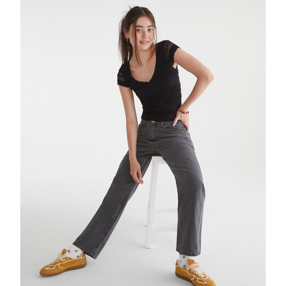 Designed in comfy stretch fabric with pretty lace designs, this femme top pairs perfectly with everything from swingy skirts to Aero jeans.