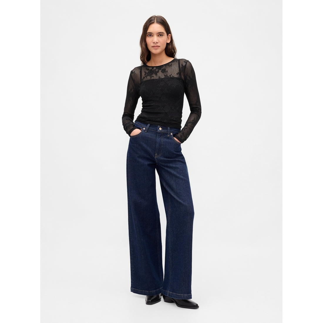 Stretchy sheer lace top. In a slightly cropped fit. Jewel neck. Long sleeves. This product was made in a factory that invests in gender equity and women’s empowerment through RISE. Learn more at gapinc. com/equity. Fit: Stretch-to-Fit. Slim & stretchy that forms to your shape. Slightly cropped, hits above the hip. Models wearing Gap size S are 5'8"–5'11" (172–180 cm) with 23. 5–26" (60–66 cm) waist & 33–38" (84–97 cm) hips. Models wearing Gap size XL are 5'8"–5'11" (172–180 cm) with 34–36” (86–91 cm ) waist & 45–50" (114–127 cm) hips.