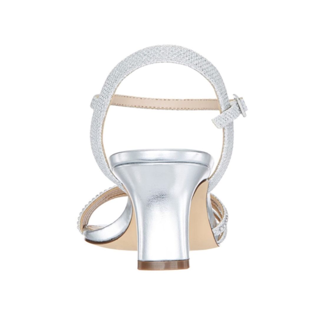 Mid heel asymmetrical evening sandal with rhinestone detail. Available in wide widths. Padded insole, flexible outsole.