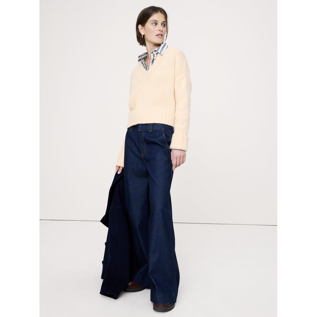 A very cool v-neck, we kept the fit here slouchy and short with dropped shoulder seams. Crafted in a warm and luxe blend of wool and alpaca. Oversized fit: Extra room through chest, shoulders, and waist. Dropped shoulder seams. V-neck. Straight hem. Oversized fit: Extra room through chest, shoulders, and waist. Dropped shoulder seams. Long sleeves. Cropped length.