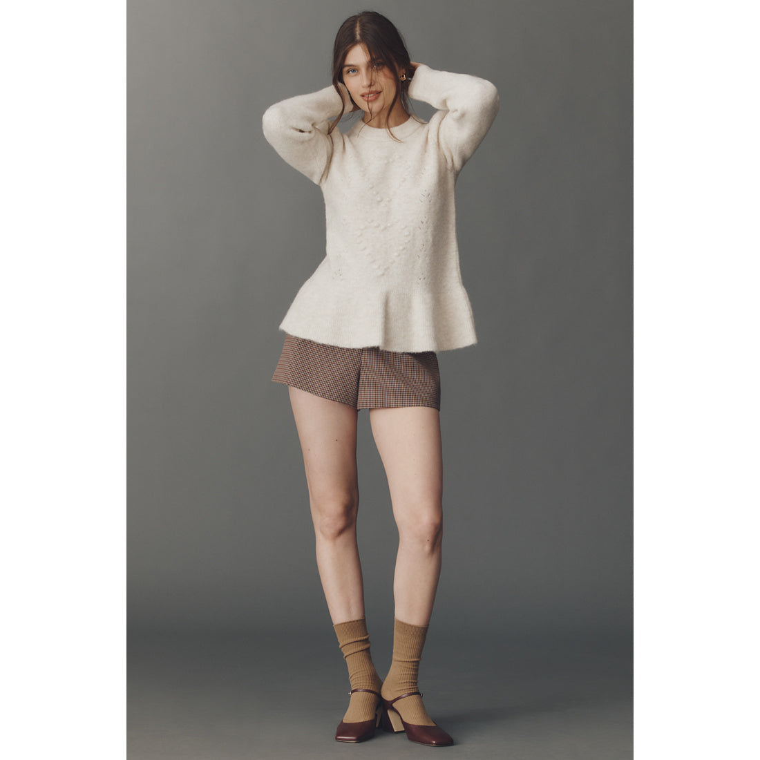 46% acrylic, 25% wool, 25% polyamide, 4% elastane Peplum silhouette with ruffled hem Crew neckline Long sleeves Pullover styling Hand wash Imported | Textured Ruffled Waist Sweater by Anthropologie in Ivory, Women's, Size: Medium, Wool/Acrylic/Polyamide