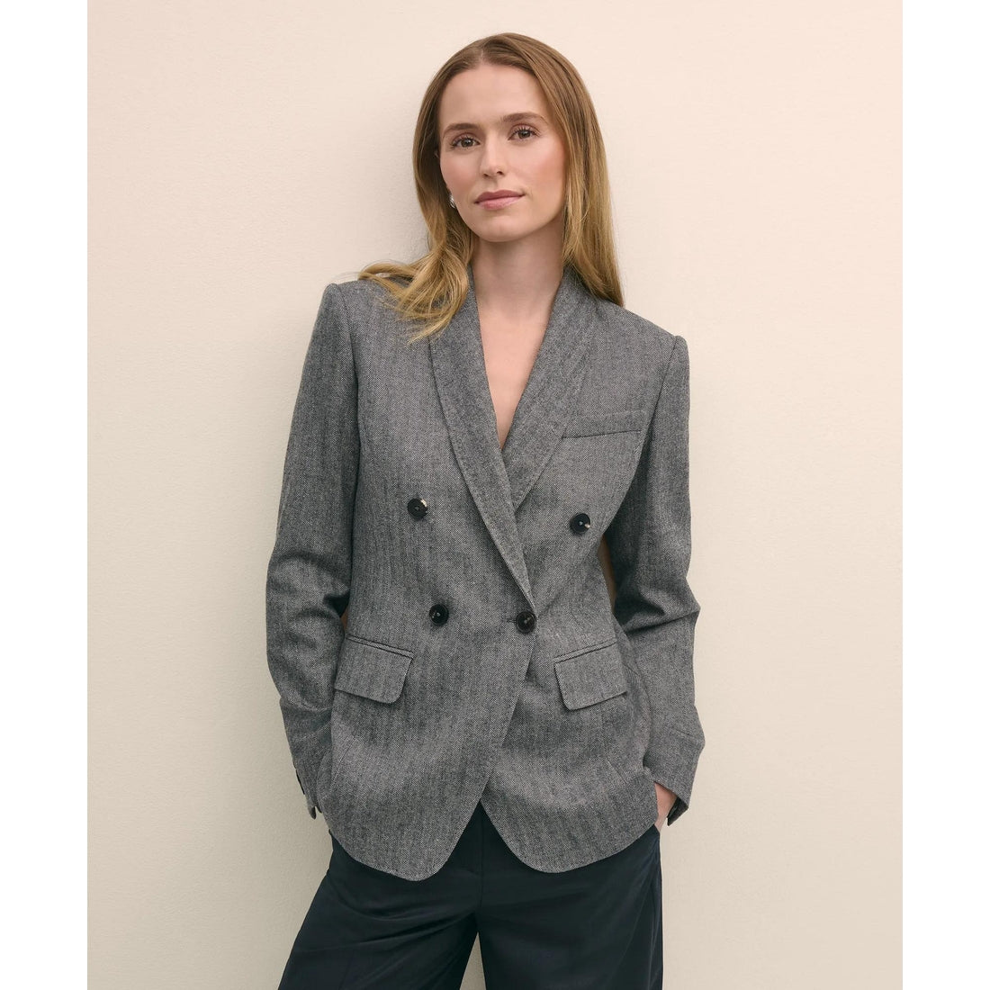 A cornerstone of classic tailoring, this double-breasted jacket is impeccably crafted in a sophisticated herringbone pattern with a wool-blend spun by Italy's renowned Lanificio di Tollegno mill. So many considered details, from the genuine horn buttons and felted undercollar to the traditional flap pockets and slanted chest pocket. This is a true investment piece, designed to anchor a wardrobe for years to come. Pair with our matching bustier, skirt and pants for coordinated style.